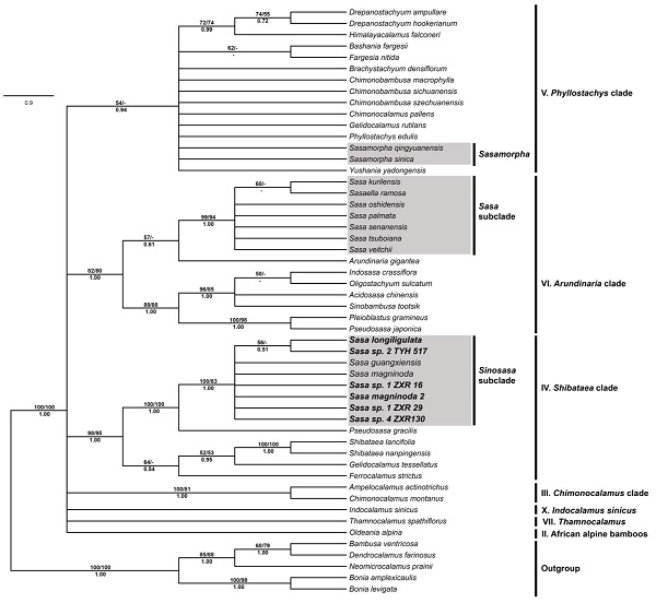 圖2. 基于8個(gè)葉綠體基因片段建立的系統(tǒng)發(fā)育樹(shù),陰影部分示赤竹屬種類(lèi)的位置。