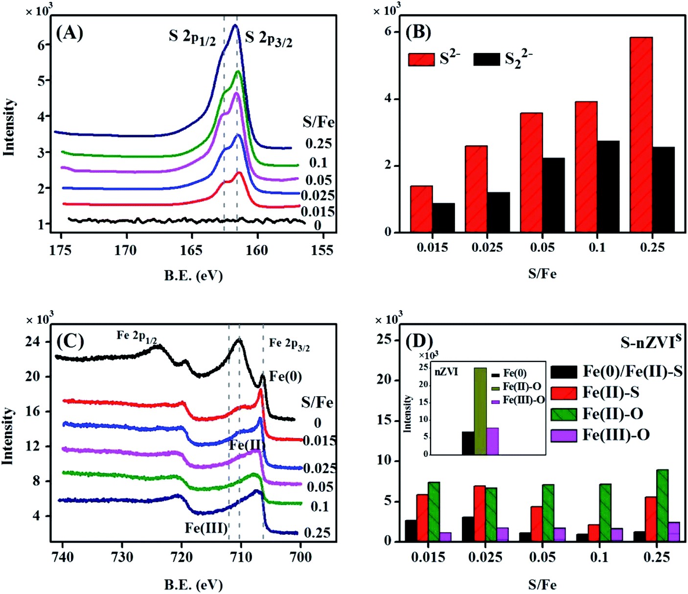 圖1不同硫鐵摩爾比下S-nZVIS XPS S 2p窄區光譜圖(A)、S形態分布圖(B)、XPS Fe 2p窄區光譜圖(C)和Fe形態分布圖(D)