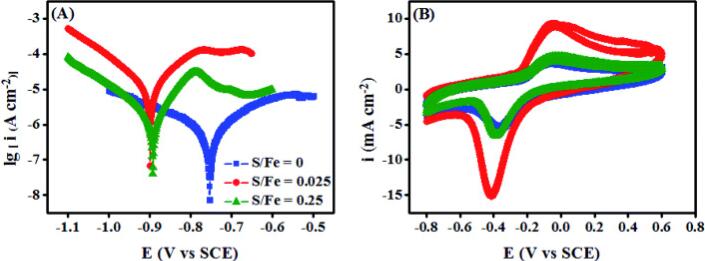 圖2不同硫鐵摩爾比條件下S-nZVIS修飾玻碳電極的Tafel極化曲線圖(A)和循環伏安曲線圖(B)