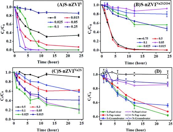 圖3 S-nZVIS (A)、S-nZVINa2S2O4(B)和S-nZVINa2S(C)對TBBPA去除的動力學過程及S-nZVIS處理受TBBPA污染的環境水樣(D)