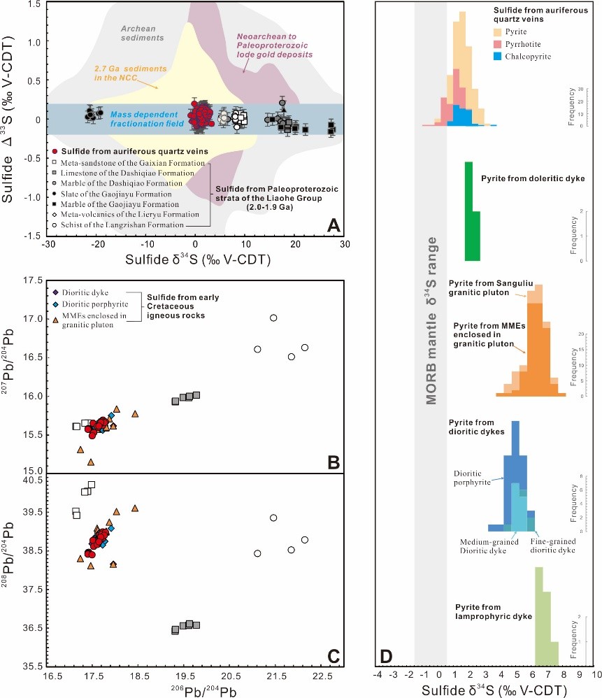 圖1 (A) 五龍金礦含金石英脈與古元古代遼河群硫化物的Δ33S和δ34S組成;(B,C)五龍金礦含金石英脈,五龍地區早白堊世火成巖,古元古代遼河群中硫化物的Pb同位素組成;(D)五龍金礦含金石英脈硫化物(黃鐵礦、磁黃鐵礦、黃銅礦),以及五龍地區早白堊世火成巖(花崗巖及其暗色包體、輝綠巖脈、閃長質巖脈、煌斑巖脈)中黃鐵礦的δ34S組成