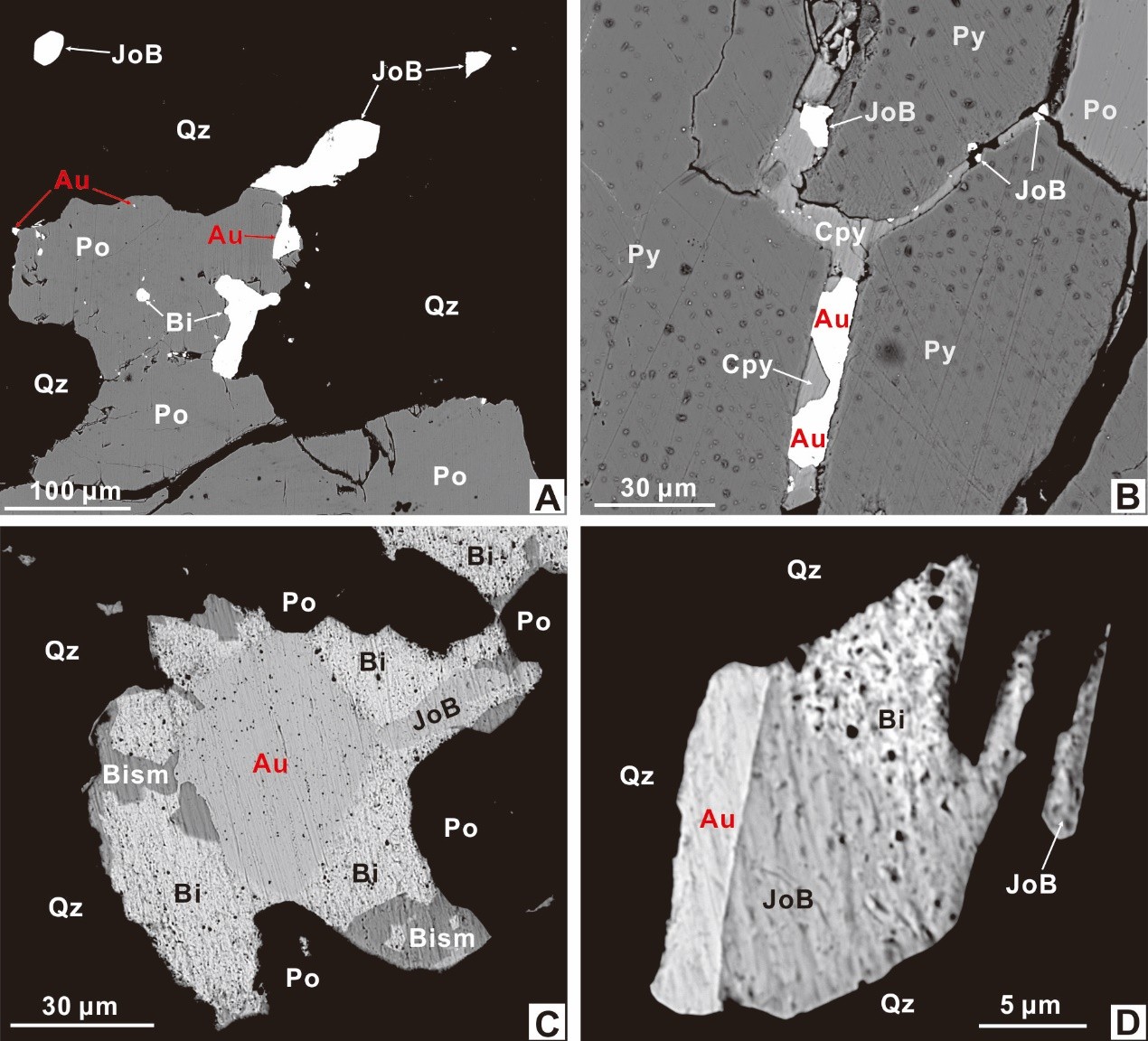圖3 (A) 五龍金礦含金石英(Qz)脈中自然金(Au)與自然鉍(Bi),硫碲鉍礦(JoB)和磁黃鐵礦(Po)緊密共生;(B)自然金,黃銅礦(Cpy),硫碲鉍礦呈細脈穿插早期形成的黃鐵礦(Py);(C)石英磁黃鐵礦階段中,自然金、自然鉍、硫碲鉍礦共生產于磁黃鐵礦邊緣,少量輝鉍礦(Bism)沿著自然鉍邊緣發生交代作用;(D),石英磁黃鐵礦階段中,自然金與自然鉍和硫碲鉍礦具有平直的共結邊
