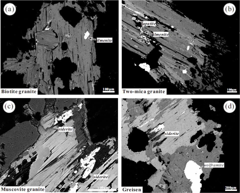 針對(duì)上述問題,中國(guó)科學(xué)院廣州地球化學(xué)研究所同位素地球化學(xué)國(guó)家重點(diǎn)實(shí)驗(yàn)室博士李潔(現(xiàn)工作單位為自然資源部第二海洋研究所)、黃小龍研究員及其合作者利用原位分析手段對(duì)我國(guó)華南地區(qū)西華山鎢礦(圖1)不同巖性花崗巖(包括:黑云母花崗巖、二云母花崗巖、白云母花崗巖)和云英巖中云母和菱鐵礦(圖2)進(jìn)行精細(xì)的礦物學(xué)研究,刻畫了成礦元素在花崗巖巖漿分異和流體運(yùn)移中的遷移和富集過(guò)程。