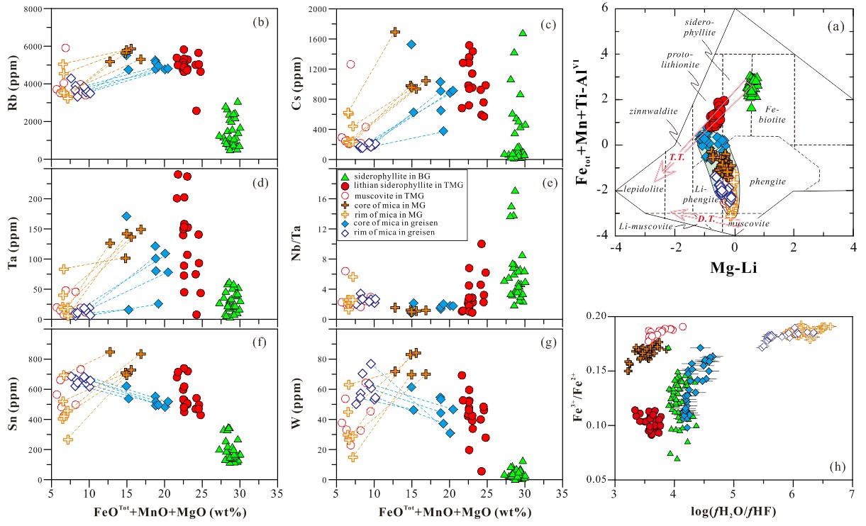 (2)白云母花崗巖和云英巖中出現(xiàn)菱鐵礦(圖2c-d),表明在巖漿演化后期存在富Fe、Mn和CO2流體;與白云母花崗巖相比,云英巖中云母具有較高的F含量和較低的Fe3+/Fe2+比值(圖3h),表明形成云英巖的流體具有較高的F含量且氧逸度相對(duì)較低;