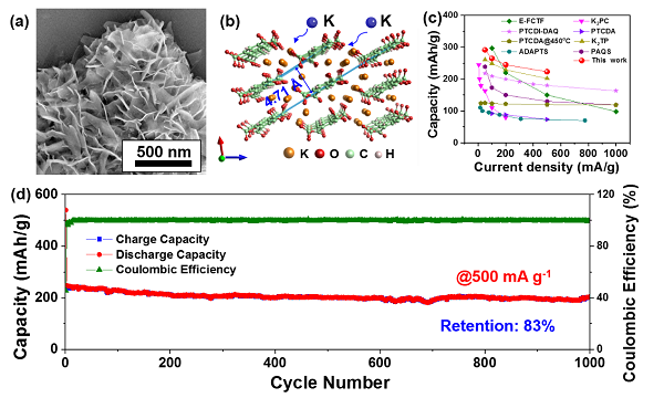圖(a)K4PM的形貌圖,(b)K4PM的晶體結構示意圖,(c)與已有報道倍率性能的對比圖,(d)基于K4PM有機電極的鉀電長循環性能圖