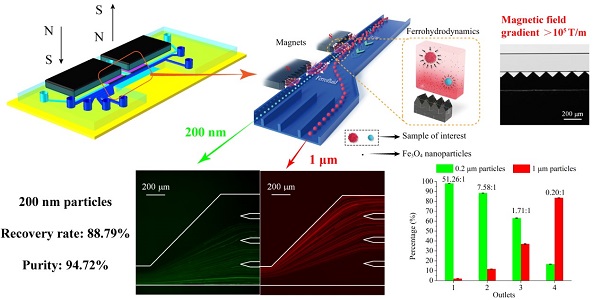 本研究中,研究人員創新性地提出用鐵磁性粉末在芯片內部合成磁極陣列,并結合高導磁合金和釹鐵硼強磁鐵,構建了片上超高梯度磁場生成系統,可在微通道內部產生高達100,000 T/m的磁場梯度,對比國際上其他已發表工作,此項工作中通過片上磁極陣列將微通道內的磁場梯度提高了100倍以上,顆粒所受的磁力也得到相應提高,因此將分選的分辨率從微米提高到納米級別。為了驗證分選效果,基于該磁場生成系統設計并制造了微流控分選芯片,成功實現了200 nm和1 μm顆粒的分選,其中200 nm顆粒的回收率為88.79%,純度高到94.72%,取得了良好的效果。本研究從機理到技術應用層面為納米顆粒無標記磁分選提供了全新方案,所開發的技術和器件為將來納米生物樣品的研究與應用奠定了堅實基礎。