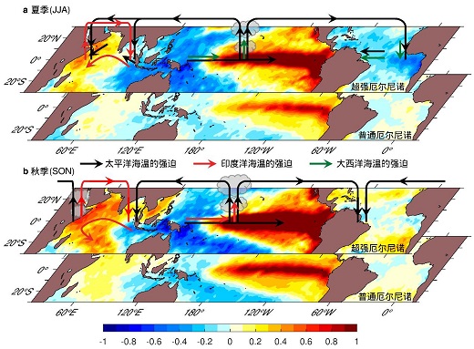 極端厄爾尼諾事件的形成時(shí)間較早,并且伴隨著夏季熱帶大西洋整體偏冷(大西洋尼娜模態(tài))和夏秋季熱帶印度洋東冷西暖(正印度洋偶極子模態(tài))的海溫格局,有別于普通的厄爾尼諾事件。