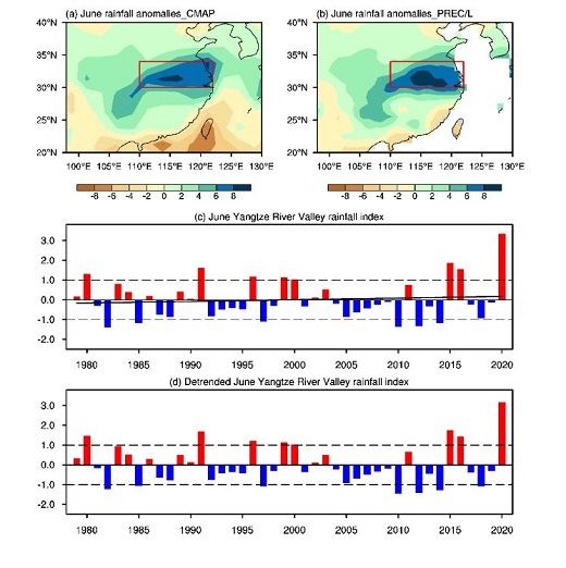 2020年6月長(zhǎng)江流域的降水破了1979年以來的紀(jì)錄(圖1)。截止到6月28日,人民網(wǎng)報(bào)道我國(guó)南方地區(qū)有超過1200萬人次受災(zāi),78人死亡或者失蹤,直接經(jīng)濟(jì)損失超過250億元。研究表明,三個(gè)大洋(太平洋、印度洋和大西洋)的海溫對(duì)2020年6月長(zhǎng)江流域破紀(jì)錄的強(qiáng)降水具有協(xié)同影響,但是大西洋起主導(dǎo)作用。