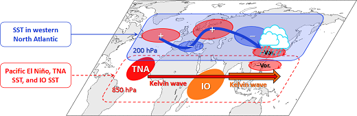-Vor.: 相對(duì)渦度負(fù)異常; 藍(lán)色箭頭: 經(jīng)過歐洲到達(dá)亞洲的大氣波列活動(dòng); IO: 印度洋; TNA: 熱帶北大西洋. 西北大西洋引起中緯度北大西洋位勢(shì)高度正異常, 通過橫跨歐亞大陸的波列活動(dòng)影響華北渦度, 而印度洋海溫和熱帶北大西洋海溫(前一年冬季太平洋的El Ni?o事件的電容器)與南海渦度的變化有關(guān). 華北渦度和南海渦度聯(lián)合造成了長(zhǎng)江流域的強(qiáng)降水. 三個(gè)大洋均對(duì)2020年6月長(zhǎng)江流域的降水有貢獻(xiàn), 但是大西洋起主導(dǎo)作用.