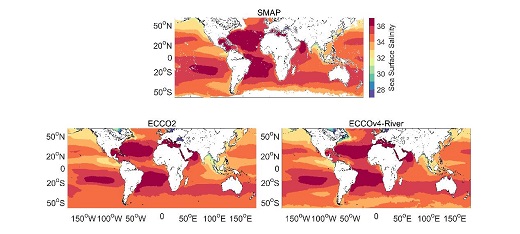 2015-2017年期間高分辨率鹽度衛(wèi)星遙感數(shù)據(jù)(SMAP)、通用18-km ECCO2(左下)和改進(jìn)ECCOv4-River(LLC540,右下)的海表面鹽度對(duì)比。改進(jìn)后河口區(qū)海表鹽度和SMAP觀測(cè)相比更為接近。