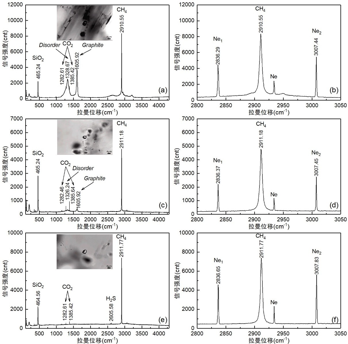 圖2 不同類型氣體包裹體的激光拉曼特征。(a)和(b):類型I氣體包裹體;(c)和(d):類型II氣體包裹體;(d)和(e):類型III氣體包裹體