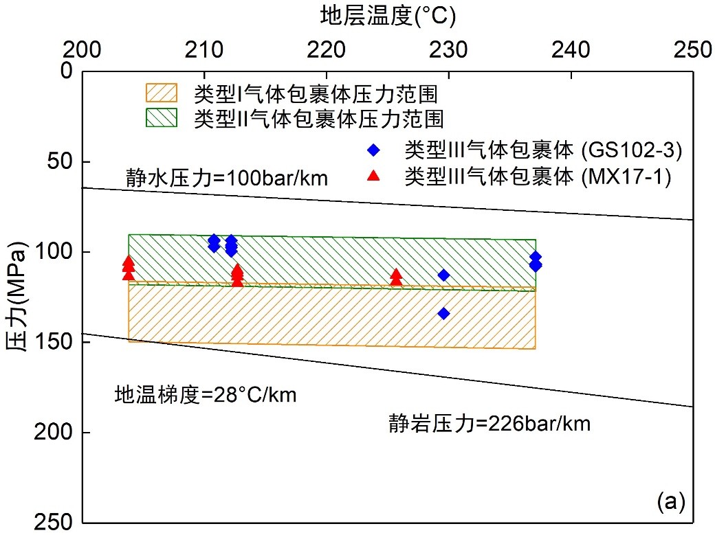 圖3 根據氣體包裹體中的甲烷拉曼位移和共生鹽水包裹體均一溫度計算得到的類型III氣體包裹體捕獲溫度和壓力以及在類型III氣體包裹體捕獲時,類型I和類型II氣體包裹體的內部壓力