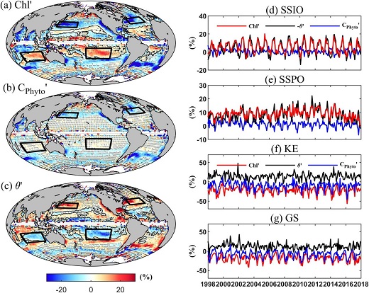 圖1. 全球中尺度渦致海表浮游植物葉綠素(Chl)、生物量(CPhyto)和碳與葉綠素之比(θ = CPhyto/Chl)的擾動分布。擾動量由反氣旋渦與氣旋渦內變量之差除以背景均值得到。右圖展示的為副熱帶流渦區的南印度洋(SSIO)和南太平洋(SSPO),以及中緯度黑潮延伸體(KE)和灣流(GS)(左圖黑色方框)海域各變量的時間變化特征。左圖中灰色細點標注的為擾動不顯著的區域。