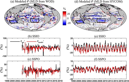 圖2. 光馴化模型模擬得到的全球中尺度渦致浮游植物碳與葉綠素之比(θ = CPhyto/Chl)的擾動分布。左圖模型所用混合層深度(MLD)由全球現場觀測的溫鹽剖面數據計算所得,右圖所用混合層深度數據來源于HYCOM模型的再分析資料。下圖展示的為副熱帶南印度洋(SSIO)和南太平洋(SSPO)光馴化模型與衛星觀測結果(圖1)的對比。