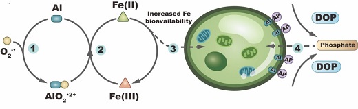 圖1鋁(Al)促進海洋浮游植物利用鐵(Fe)和溶解有機磷(DOP)示意圖