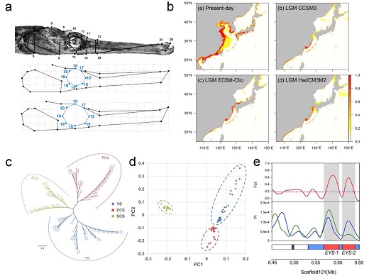 圖1:薛氏海龍的生態位與譜系分化特征。a. 薛氏海龍不同種群的形態特化;b. 薛氏海龍的當前分布與冰期分布特征;c-d. 薛氏海龍不同地理種群的遺傳譜系分化;e. 全基因組選擇分析篩選到的與薛氏海龍本地適應性相關的候選基因(eys基因, 與眼睛發育相關)