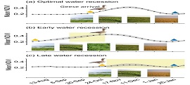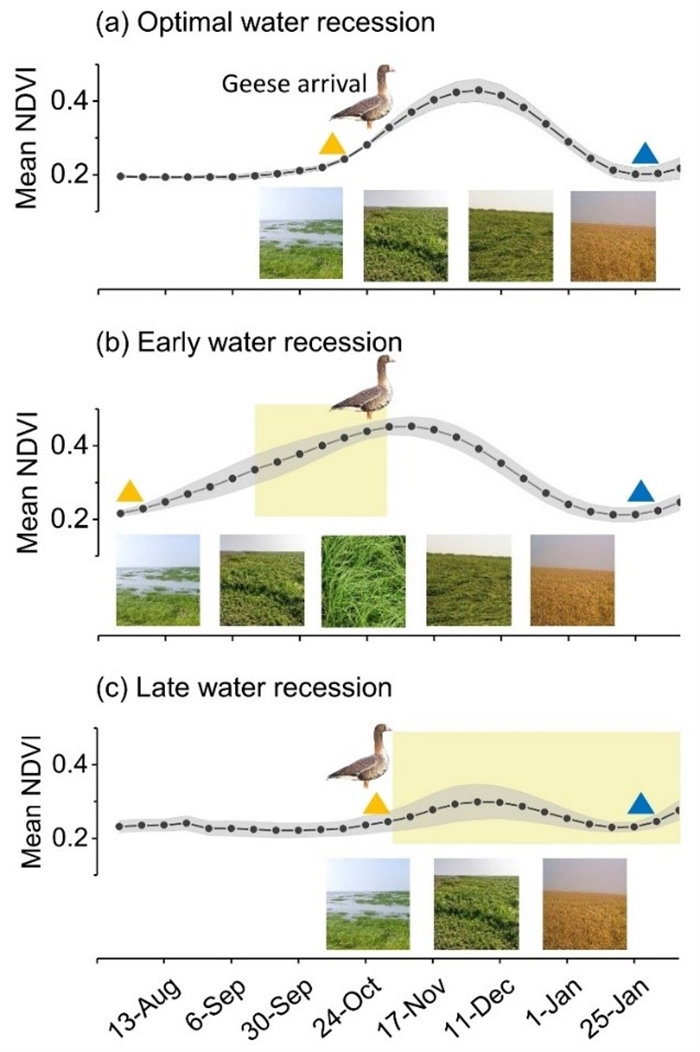 研究團(tuán)隊(duì)發(fā)現(xiàn),不同的退水模式(包括正常退水、提前退水、推遲退水)會顯著影響雁類到來時(shí)的NDVI和棲息地面積。非正常退水(包括提前和推遲退水)會導(dǎo)致較大的物候錯(cuò)配,并最終導(dǎo)致小白額雁在東洞庭湖較小的種群數(shù)量和更集中的分布。