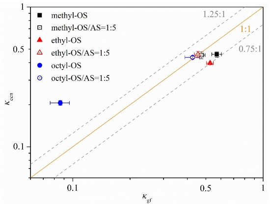 圖2. 甲基、乙基、辛基硫酸酯及其與硫酸銨內混氣溶膠在亞飽和(κgf)及過飽和(κccn)條件下的吸濕性參數