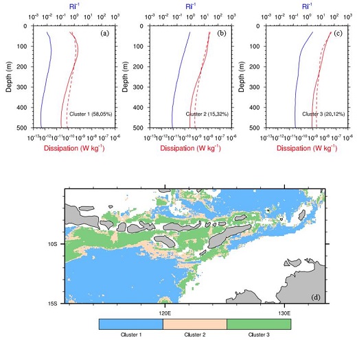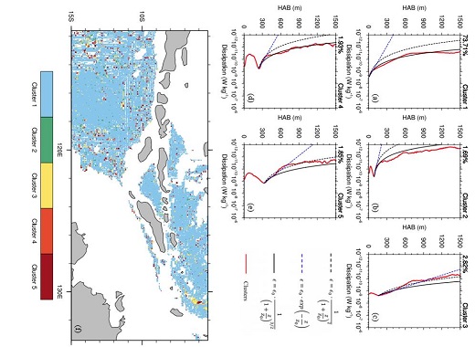 研究人員基于一個垂向高分辨率的非靜力海洋模式,對印尼貫穿流出口處的內潮耗散率垂向結構進行聚類分析,以探究內潮耗散率垂向結構的多樣性及空間分布特征。研究結果表明:在海洋底部附近,內潮耗散率存在5種典型的垂向結構(圖1,其中底部增強結構分布最為廣泛),而且從耗散率最大值點向上衰減的垂向結構均可由同一指數函數近似擬合;而在溫躍層附近,內潮耗散率存在3種垂向結構(圖2,其中溫躍層增強結構多分布于水深較深的區域,而表面增強結構多分布于水深較淺的島嶼邊緣),而且均與Ri-1(Richardson數的倒數)存在顯著的相關。