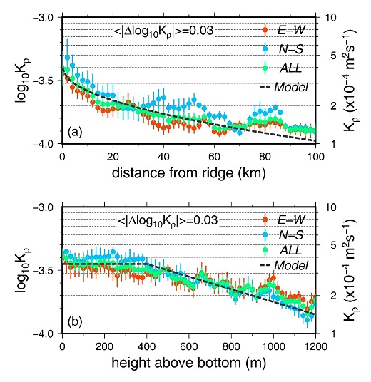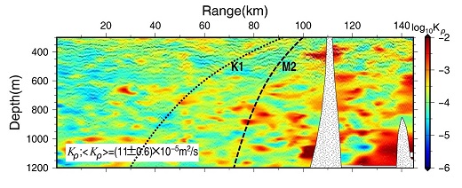 圖1:跨越馬里亞納海脊處的擴(kuò)散系數(shù)剖面,靠近海脊處的擴(kuò)散顯著增強(qiáng)