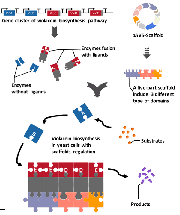 圖2 利用人工支架蛋白提高紫色桿菌素產量。