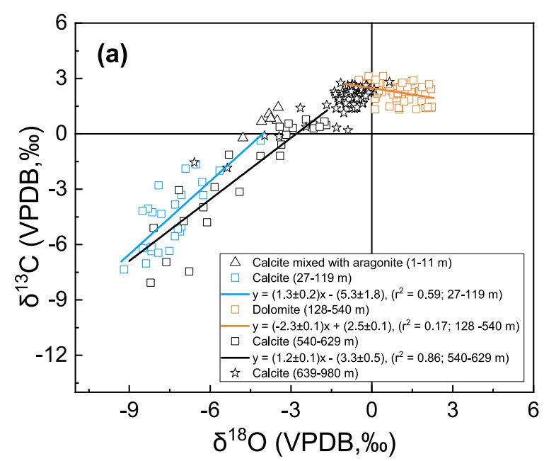 圖1 不同深度碳酸鹽碳氧同位素組成特征