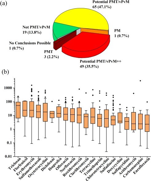 圖1:(a) 我國(guó)地表水體中PPCPs的持久性、遷移性及毒性特征分類, (b) 地表水體中主要PPCP-PMTs濃度箱線圖