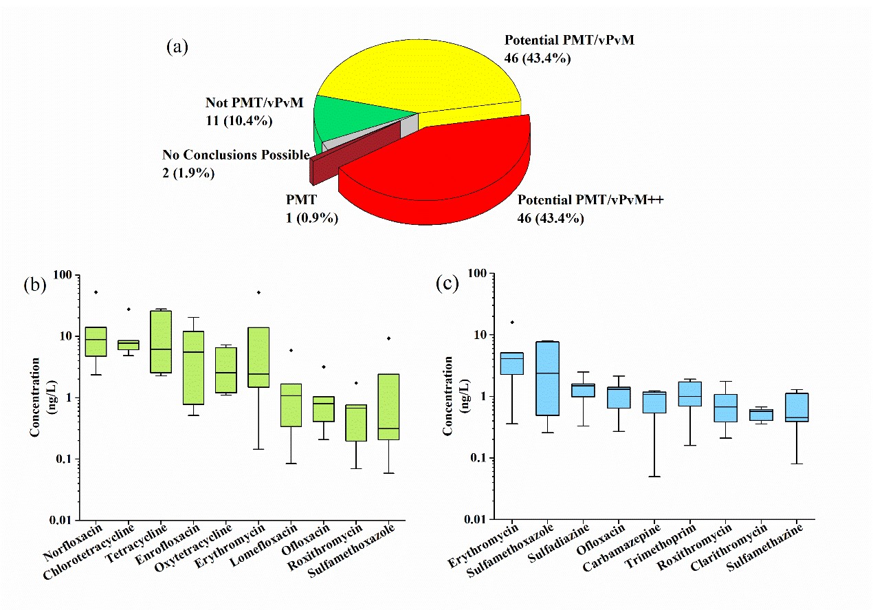 圖2:(a) 我國(guó)地下水及飲用水中PPCPs的持久性、遷移性及毒性特征分類 (b) 地表水中PPCP-PMTs濃度箱線圖 (c) 飲用水中PPCP-PMTs濃度箱線圖