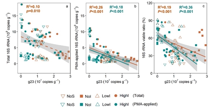 中國(guó)科學(xué)院亞熱帶農(nóng)業(yè)生態(tài)研究所吳金水研究員團(tuán)隊(duì)向滅菌土壤中加入稀釋不同梯度的未滅菌土壤懸濁液進(jìn)行微宇宙培養(yǎng)試驗(yàn),利用qPCR檢測(cè)總細(xì)菌豐度和活性細(xì)菌豐度(疊氮溴化丙錠預(yù)處理去除非活菌DNA),利用g23標(biāo)記基因豐度指示T4型噬菌體豐度,最終闡明T4型噬菌體與土壤有機(jī)碳礦化之間的關(guān)系。結(jié)果表明,g23基因豐度與總細(xì)菌16SrRNA基因豐度和活性細(xì)菌16SrRNA基因豐度之間存在顯著的負(fù)相關(guān)關(guān)系,總g23基因豐度降低了活細(xì)菌16SrRNA基因比率(圖1)。這些結(jié)果表明,T4型噬菌體可以殺死土壤細(xì)菌,從而降低活性細(xì)菌的豐度,調(diào)控細(xì)菌的種群大小。