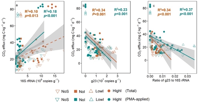 g23基因豐度與CO2礦化速率呈負(fù)相關(guān)關(guān)系。同樣地,隨著g23基因豐度:活細(xì)菌16SrRNA基因豐度比例的增加,CO2礦化速率降低,且強(qiáng)于g23基因豐度:總16SrRNA基因豐度(圖2)。這些結(jié)果表明,T4型噬菌體可以殺死土壤細(xì)菌,從而降低土壤有機(jī)碳的礦化。