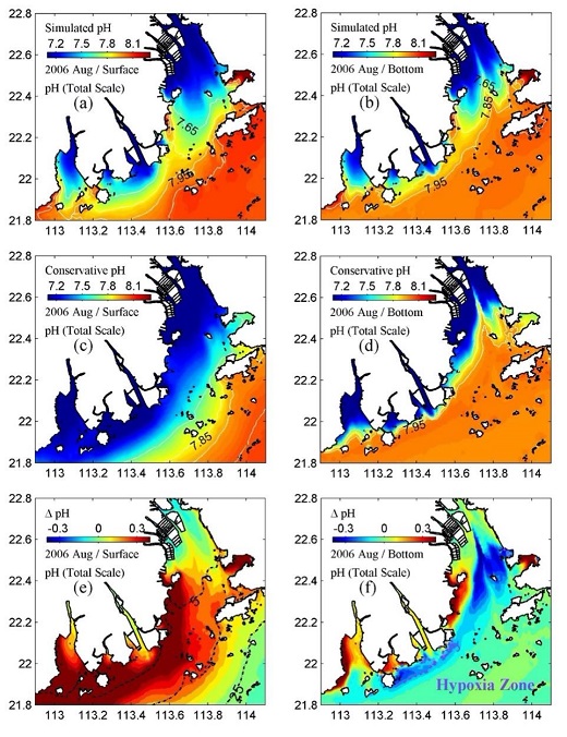 圖1. 2006年8月珠江口表層月均(a, b)模式模擬的pH、(c, d)保守混合方法計(jì)算的pH及(e, f)富營養(yǎng)化引發(fā)的pH變化(ΔpH)的空間分布。(a-d)中的白色等值線表示pH值等值線;(e)中的黑色等值線分別表示鹽度為5‰、15‰、25‰的等值線;(f)中的紫色輪廓表示缺氧區(qū),定義為DO≤3 mg L?1