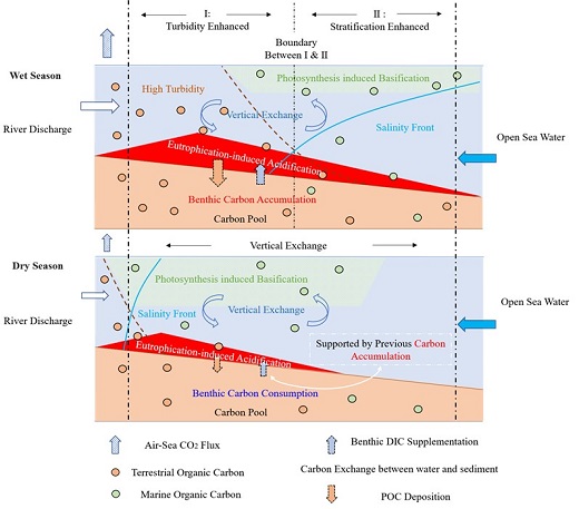 在河口與近岸海域,富營養(yǎng)化導(dǎo)致了活躍的有機(jī)物礦化過程并引發(fā)碳酸鹽體系的改變,加速了該區(qū)域的海洋酸化進(jìn)程。揭示富營養(yǎng)化導(dǎo)致的海水酸化現(xiàn)象的生消機(jī)制與控制因素,對(duì)于近岸海洋環(huán)境的保護(hù)具有重要意義。
