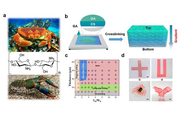 圖2:(a)殼聚糖是從蝦蟹等甲殼中提取的天然多糖(圖片來(lái)源于網(wǎng)絡(luò))(b)殼聚糖(CS)水凝膠自上而下交聯(lián)梯度設(shè)計(jì)示意圖;(c)殼聚糖水凝膠薄膜三維形態(tài)可控編輯相圖;(d)殼聚糖水凝膠復(fù)雜三維形態(tài)可控編輯。