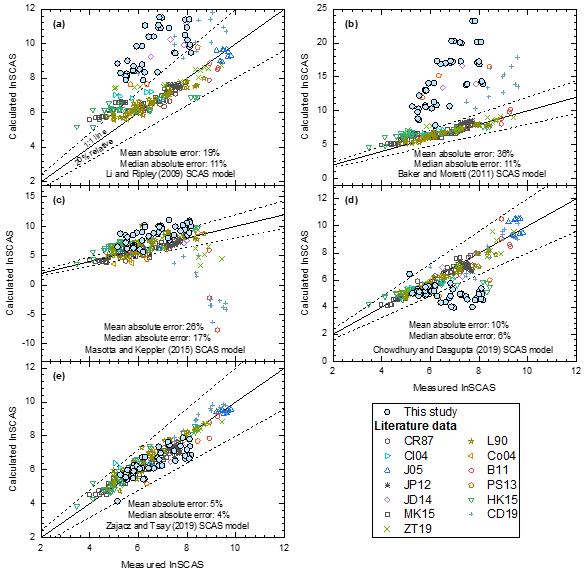 圖1 不同經(jīng)驗模型計算得出的SCAS與實測值對比。實線代表計算值與實測值相等,虛線代表計算值為實測值的0.8倍和1.2倍