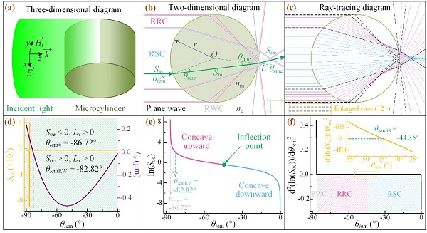 對于由最廣泛使用的柱、球等圓形電介質微粒產生PNJs,有一個眾所周知但長期缺乏系統研究的基本規律:當照射光分別通過微粒入射界面的邊緣或中間部分時,光會在微粒出射界面的后部分別形成快速或緩慢兩種不同的會聚-發散模式。如何確定入射界面邊緣和中間部分區域之間的邊界點,是科學揭示和闡述這一規律的關鍵。團隊研究人員在前期工作的基礎上,開創性地認識到光會聚-發散的速度與出射光斜率變化的快慢有關,這恰好與數學當中自然對數所揭示的含義相同。通過對函數曲線的對數化和微分運算,得出凹凸變化曲線的“拐點”(inflection point)位置,這一位置正好是界定入射界面邊緣和中間區域的邊界點。在“拐點”視角下,研究人員重新審視和分析了光照射微粒入射界面中間區域形成長的PNJs和照射邊緣區域形成短的近場聚焦等特征光場,提出并展示了一種調制PNJs以及產生和調制彎曲PNJs的新方法,即通過調節邊緣和中間區域的入射光強度實現調制,無需對微粒本身的材料屬性和幾何形貌等做任何改變。