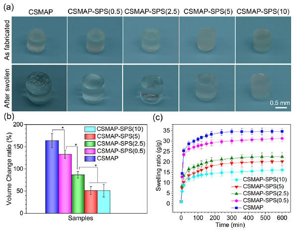 天然多糖基水凝膠由于其優異的生物相容性、生物安全性和生物降解性而被用作骨修復和重建的 3D 支架。然而,這些水凝膠在機械性能、成骨、血管生成和生物礦化等性能的劣勢阻礙了其實際應用。本研究的主要目的是通過用甲基丙烯酸酐(MA)及膦酰基丙酸(P)進行改性,開發一種創新型的水溶性磷酸鹽功能化殼聚糖(CSMAP)。在紫外線照射下,將CSMAP 和合成的磷硅酸鍶(SPS, Sr5(PO4)2SiO4)生物陶瓷納米粒子與光引發劑結合,制備了一種新型光交聯復合水凝膠,并檢測了含不同濃度的納米SPS顆粒(0.5、2.5、5 和 10 mg/mL) CSMAP復合水凝膠的膨脹、機械、形態、生理化學、成骨、血管生成等性能。CSMAP-SPS復合水凝膠具有排列良好的多孔網絡結構。SPS顆粒的加入能改善CSMAP水凝膠的壓縮強度和模量。SPS中具有生物活性的Sr、P和Si離子能持續、可控地從CSMAP-SPS水凝膠中釋放,并一直處于無毒水平。復合水凝膠可促進體外無定形磷灰石沉積,具有優異的生物礦化活性。體外研究表明,復合水凝膠對前成骨細胞MC3T3-E1細無毒性,可誘導MC3T3-E1成骨分化,通過檢測毛細血管長度、分支點、和血管生成基因 vegf 表達證明此水凝膠的促血管生成作用。本研究中制備的新型CSMAP-SPS水凝膠在骨再生方面有一定的應用前景。