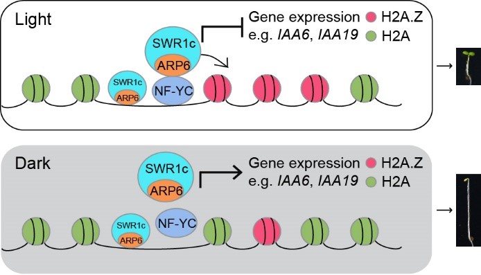 中科院華南植物園農業與生物技術研究中心助理研究員張春雨在侯興亮研究員的指導下,發現光信號通過NF-YCs促進H2A.Z在下胚軸伸長相關基因位點上的沉降,并抑制光形態建成中下胚軸的伸長。通過一系列蛋白相互作用的實驗分析,發現NF-YCs能夠與SWR1復合體關鍵組分ARP6會發生光依賴性的互作。遺傳分析表明,NF-YCs和ARP6在光形態建成中作為下胚軸伸長的負向調控因子發揮作用,并且NF-YCs在該進程中的作用部分依賴于ARP6的功能。ChIP-PCR實驗結果表明,NF-YCs和ARP6共同調控了它們靶基因位點上的H2A.Z的沉降水平,與遺傳分析結果類似,NF-YCs調控H2A.Z沉降主要依賴于ARP6。因此,該項研究揭示了NF-YCs-ARP6這一新的轉錄調控模塊,在光形態建成過程中通過介導H2A.Z在下胚軸伸長相關基因位點上的沉降,并調控其轉錄表達,從而抑制下胚軸伸長的作用。