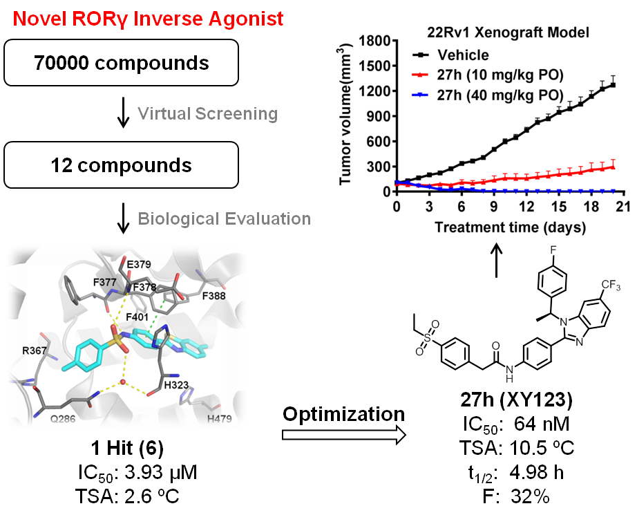 近期,該團隊通過虛擬篩選、基于結(jié)構(gòu)的藥物設(shè)計和構(gòu)效關(guān)系研究,獲得了一系列苯并咪唑類RORγ小分子抑制劑,這些化合物對RORγ表現(xiàn)出顯著的抑制活性。代表性化合物XY123可有效抑制RORγ的轉(zhuǎn)錄活性(IC50 = 64 nM),增強RORγ-LBD的熱穩(wěn)定性(ΔTm = 10.5 °C)。同時,XY123具有優(yōu)越的選擇性、良好的代謝穩(wěn)定性和藥代動力學特性(t1/2 = 4.98 h,F = 32%)。另外,XY123也開展了前列腺癌活性評價及克服耐藥機制研究。結(jié)果顯示,XY123可以抑制多種前列腺癌細胞的增殖與克隆形成,同時可有效抑制前列腺癌細胞中AR調(diào)控的下游基因的表達。XY123還可有效抑制前列腺癌細胞中AR全長和AR突變體的表達。在22Rv1異種移植的前列腺癌小鼠模型中,通過口服給藥XY123可實現(xiàn)腫瘤的長期完全消退。XY123可作為一個有前景的先導化合物用于前列腺癌及其臨床耐藥藥物的開發(fā)。