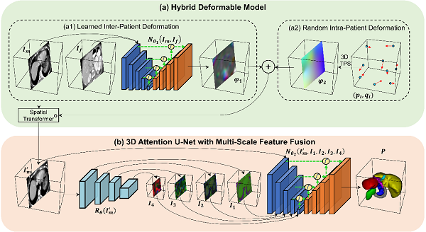 對此,研究團隊提出了一種混合形變模型(Hybrid Deformable Model, HDM)的新型數據擴充方法,極大緩解了因訓練數據不足導致的網絡過擬合問題。HDM由不同病人間的臟器配準形變和同一病人內的臟器隨機形變組成,如圖1(a)所示。相比于傳統的數據擴充方法,HDM因其產生幾何變化的多樣性,使網絡更能捕捉到腹部CT中不同形態的臟器位置。HDM不僅能用于醫學圖像分割,還可以用于圖像配準和圖像重建,有望成為一種基于深度學習的通用數據擴充方法。此外,研究團隊設計了一個基于三維注意力機制的多尺度特征融合網絡,有效地降低了網絡的訓練難度并提升了分割精度,如圖1(b)所示。通過在多中心的腹部CT數據上的交叉驗證,結果顯示研究團隊提出的方法成功實現了腹部CT多臟器智能分割,如圖(2)所示。