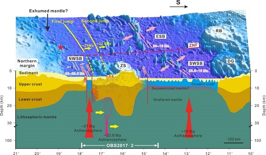 中國科學院南海海洋研究所邊緣海與大洋地質重點實驗室(OMG)深部地球物理學科組博士研究生黎雨晗、副研究員黃海波、研究員丘學林,聯合德國亥姆霍茲海洋研究中心(GEOMAR)教授Ingo Grevemeyer,通過主動源海底地震儀(OBS)探測和深部地殼結構模擬,在中沙地塊的伸展-海底擴張過程的研究上取得重要進展,相關研究成果近日發表在國際地學期刊Gondwana Research(《岡瓦納研究》)上。