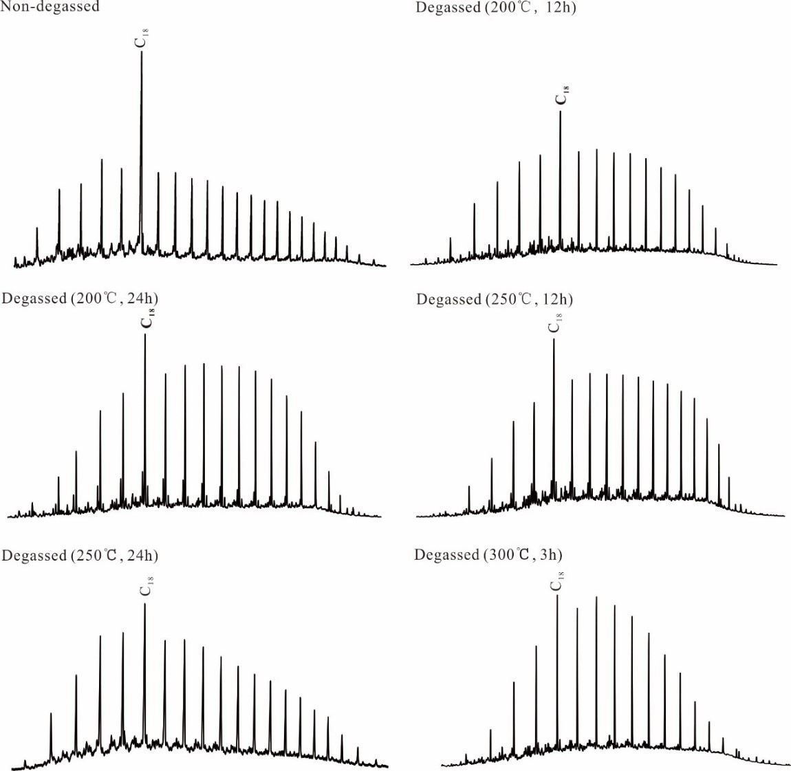 圖2.不同脫氣條件下獲得的鍵合態飽和烴的氣相色譜圖