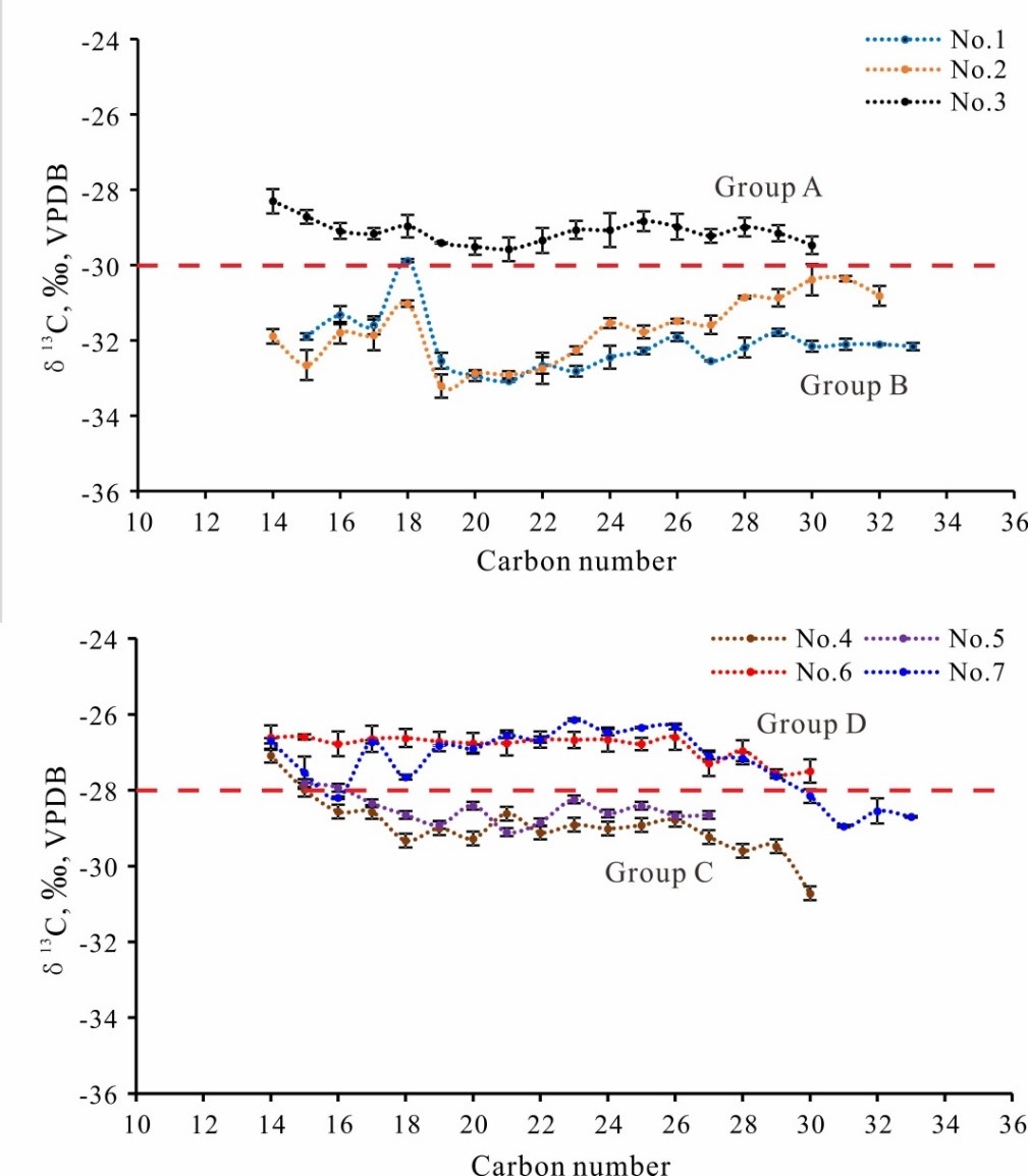 基于上述問題,在中海油(中國)有限公司深圳分公司的支持下,中國科學院廣州地球化學研究所熊永強研究員課題組的博士研究生袁麗平與蔣文敏博士后在已有的催化加氫熱解(HyPy)方法的基礎上,增加巖屑樣品離線脫氣環節,并結合GC-IRMS技術,對珠江口盆地白云深水區有效烴源巖(文昌組和恩平組)中鍵合態正構烷烴分布和單體烴碳同位素組成(δ13C)進行分析,旨在扣除油基泥漿污染的前提下,進一步揭示研究區各層系烴源巖的真實特征。