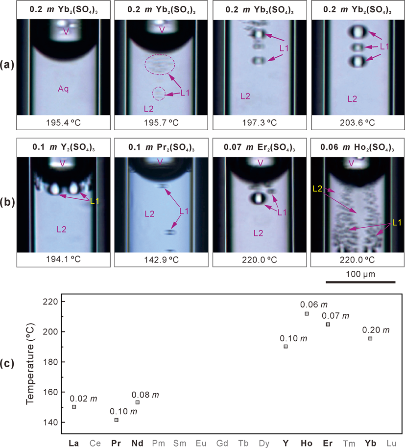 研究表明,含稀土硫酸鹽熱液在高溫條件下可分離為不混溶的兩種液相,一為高度富集REE和硫酸鹽的高密度液相(L1),一為貧REE和硫酸鹽的低密度液相(L2) (圖1)。這種現(xiàn)象傾向于在富CO2、低壓和低氯化物含量的熱液中發(fā)生。由于不混溶的兩個液相具有明顯的密度差異且貧REE液相作為基質(zhì)具有較低的粘度,富REE液相將在重力作用下與貧REE液相高效分離,從而實現(xiàn)熱液體系中REE的高效富集,為高品位稀土礦床的形成提供物質(zhì)基礎(chǔ)。
