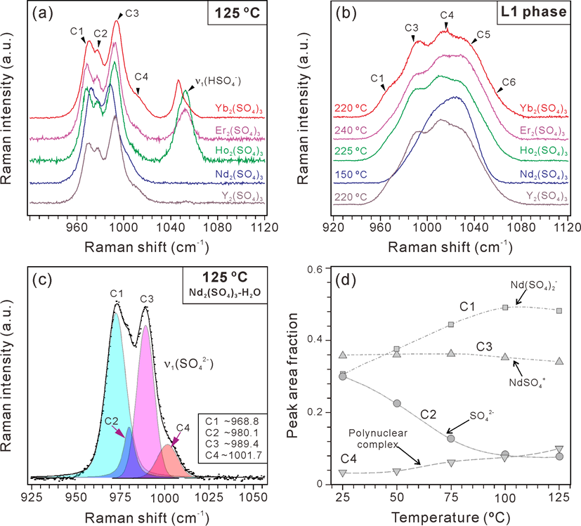 應(yīng)用原位拉曼光譜分析技術(shù)對高溫高壓條件下流體的組成和結(jié)構(gòu)進(jìn)行了在線分析。結(jié)果表明,除了前人報道的REESO4+和REE(SO4)2–外 (C3, C1),REE3+與SO42-可形成更為復(fù)雜的絡(luò)合物(REEm(SO4)n3m-2n, m>1,C4, C5, C6) (圖2)。上述復(fù)雜絡(luò)合離子對的形成導(dǎo)致了熱液流體中液-液不混溶的發(fā)生。此外,HSO4–也可與REE3+直接絡(luò)合并遷移REE (圖2)。