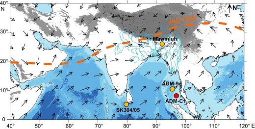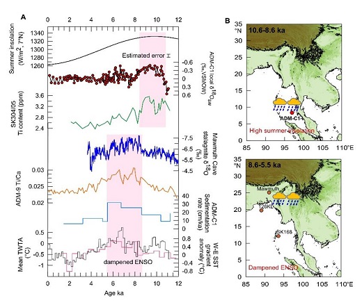研究人員利用印度洋安達曼海南部沉積柱樣ADM-C1中浮游有孔蟲Globigerinoides ruber sensu stricto (s.s.) (white)的Mg/Ca和氧同位素,重建了該區域的表層海水溫度和海水氧同位素變化(δ18Oseawater)曲線,發現熱帶印度洋區域的印度洋夏季風降雨量在過去10.6-8.6千年時最大,在過去8.6-5.0千年時有所減弱,在過去5千年以來進一步下降。同時,研究人員還發現該沉積鉆孔中沉積物的沉積速率和敏感粒級結果在過去8.6-5.5千年時達到最高值,并認為這與東印度洋以北地區的河流集水盆地地區的降雨量和河流入海量有關。通過整合印度洋夏季風區域的其它古氣候記錄對比,研究人員認為在亞熱帶輻合帶、厄爾尼諾和南方濤動(ENSO)和印度洋偶極子活動的共同作用下,印度洋夏季風最大降雨量在早全新世期間存在一個明顯的經向移動過程,即熱帶東印度洋低緯區域的夏季風降雨量在過去10.6-8.6千年時達到最大,在過去8.6-5.5千年時向北移到了東印度洋以北的亞熱帶區域。