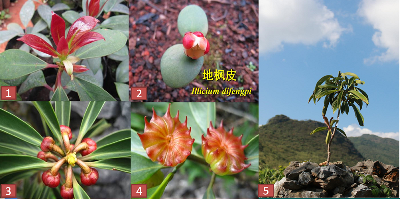 地楓皮(Illicium difengpi)是八角科常綠灌木,又名高山龍、山八角。地楓皮的莖皮和根皮具有祛風除濕,行氣止痛等功效,是桂龍藥膏、桂龍藥酒及多種中成藥的主要原料。同時,地楓皮葉片濃綠肥厚、嫩葉和幼果紅色,樹型優美,具有很高的觀賞價值,是喀斯特地區非常有開發利用前景的野生藥用植物(圖1)。其抗旱性強,主要生長在喀斯特石山山頂的裸巖及半裸巖山地上,林下也有少量分布,因生境退化和過度采集而面臨滅絕威脅。