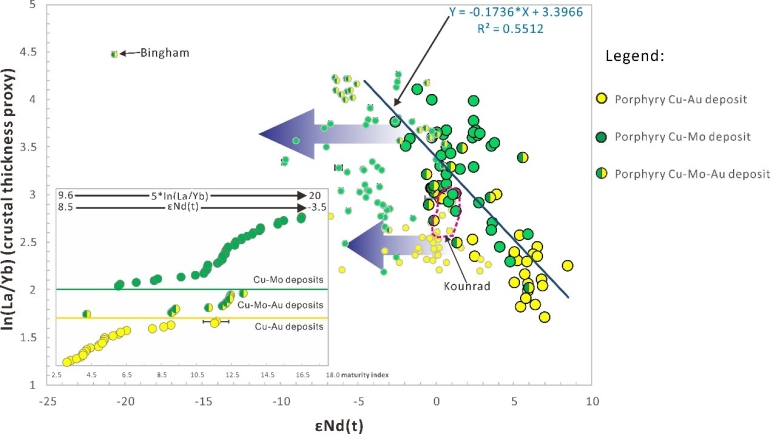 圖2 中亞造山帶及全球斑巖銅礦Nd同位素值和地殼厚度指標的相關性圖(插圖為斑巖銅金和銅鉬礦床的地殼成熟度指標計算結果)