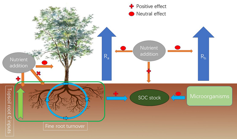 研究發現,木麻黃各部分的生長并未受到氮磷施肥的影響,但是氮添加顯著增加了枝條中的氮含量。土壤呼吸也未受到施肥措施的影響。因此,施肥措施并未顯著影響這些海岸帶防護林的固碳能力,但是氮或者磷的添加顯著增加了表層土壤中的有機碳。盡管土壤呼吸均未受到施肥的影響,但是由于木麻黃的細根為了吸收表面的營養物質,會在土壤表層形成更多的細根,同時細根的周轉率提高,使土壤表面的有機碳含量增加,從而提高表層土壤有機碳(圖2)。他們進一步通過與其他生態系統進行比較,發現海岸帶木麻黃林在構建初期固碳能力具有很明顯的優勢。其結果表明,氮磷添加雖然沒有增加木麻黃人工林的固碳能力,但是使土壤中的碳含量增加,這可以改善海岸帶生態系統的土壤狀況,為其他植物生長提供物質基礎。總體上,該研究表明幼齡木麻黃林能夠在海岸帶貧瘠的土壤中健康成長,并且在沒有外來營養物質輸入的情況下依然具有很強的固碳能力。