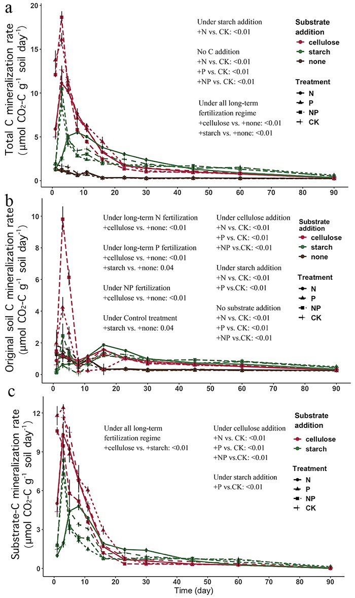 土壤有機(jī)碳周轉(zhuǎn)受到基質(zhì)和養(yǎng)分有效性的強(qiáng)烈影響,特別是氮(N)和磷(P)。雖然已有許多短期氮磷添加實(shí)驗(yàn)研究養(yǎng)分有效性和土壤有機(jī)質(zhì)(SOM)礦化之間的關(guān)系,但是利用長(zhǎng)期施肥土壤來(lái)探究SOM礦化的研究并不多。長(zhǎng)期施肥會(huì)改變土壤的生物化學(xué)性質(zhì),因此,SOM礦化在短期或單一的養(yǎng)分輸入之下的變化不能很好地反應(yīng)長(zhǎng)期施肥或養(yǎng)分沉積對(duì)其帶來(lái)的影響。