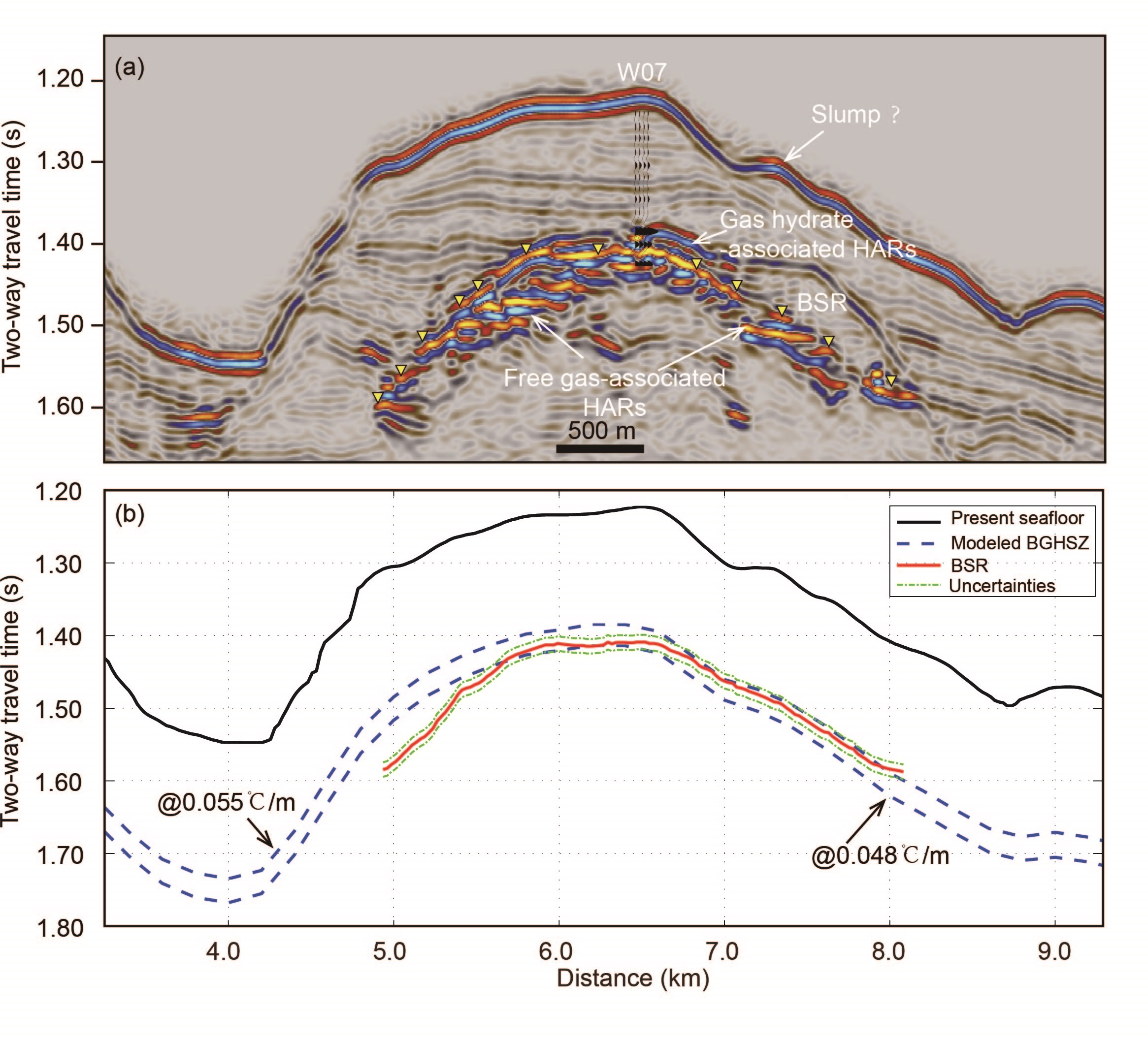 圖1 a)高分辨地震剖面指示天然氣水合物及游離氣分布特征 b) 地震剖面上解釋的BSR分布與理論計(jì)算的水合物穩(wěn)定帶底的對比